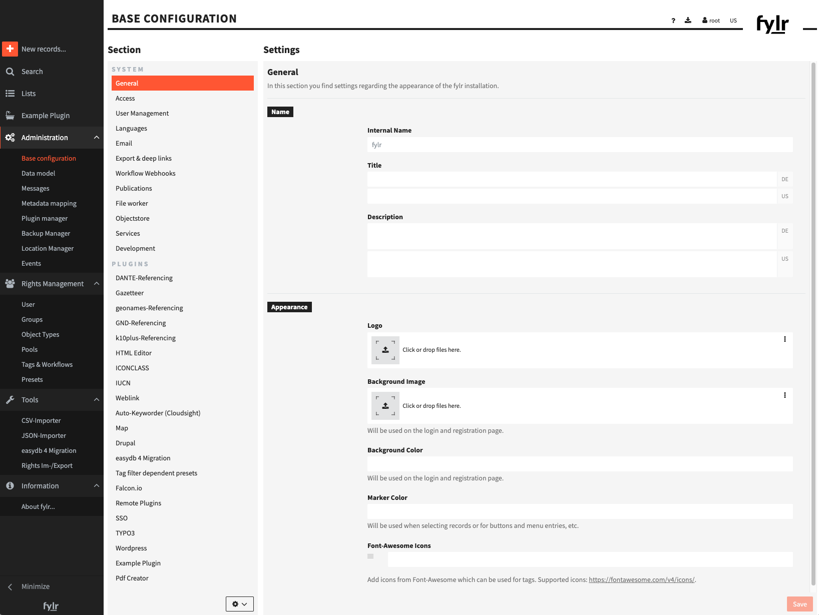 In the base configuration you find general settings that affect the whole fylr. Such as display name, appearance, preview generation, user registration, email settings, etc.