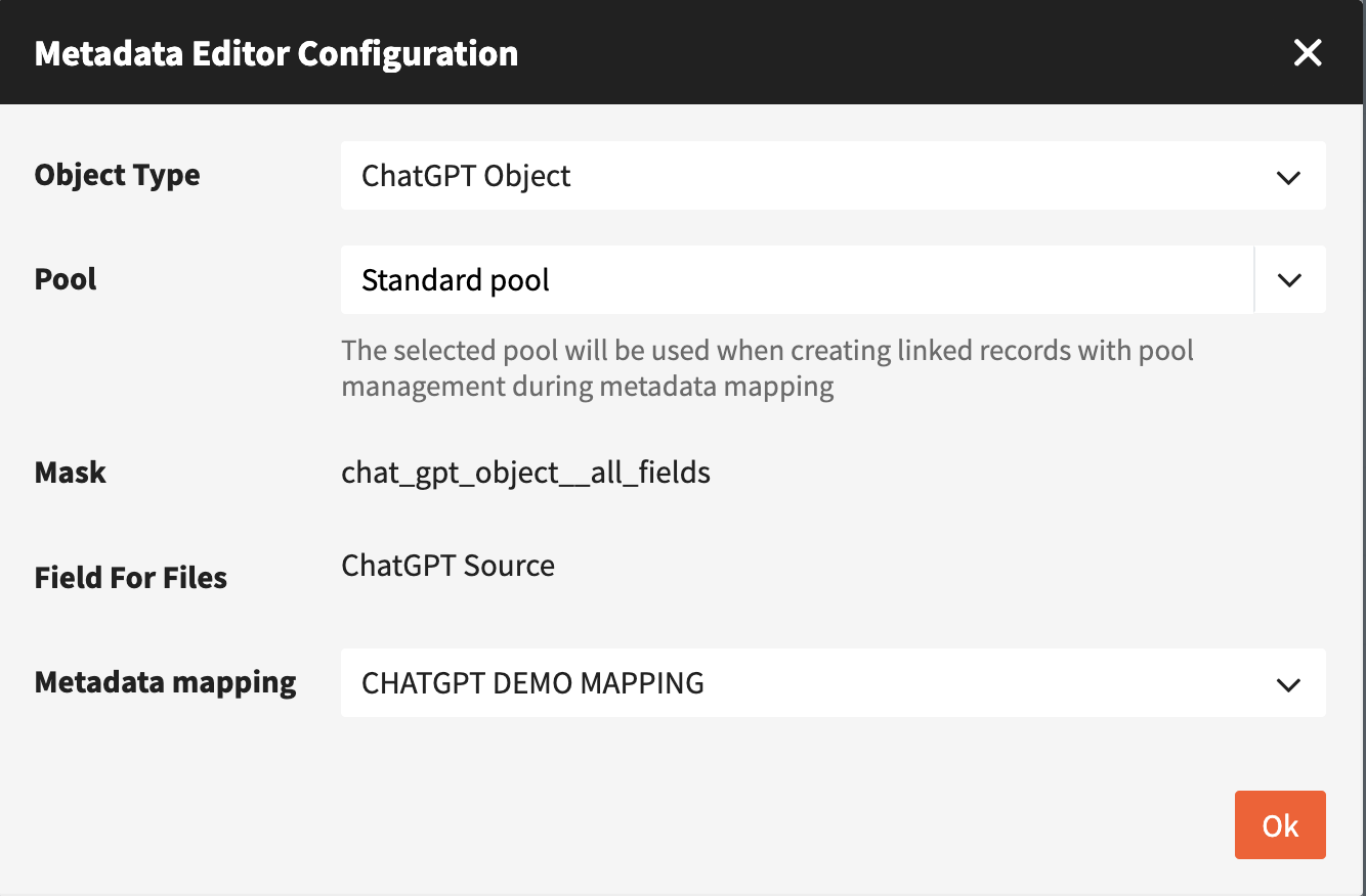 The **ai-metadata plugin** enables the integration of OpenAIs ChatGPT into a fylr instance by automatically filling object type fields. Custom prompts can be configured and mapped to fylr object types through metadata mappings. The generated output is written directly to objects during their creation.