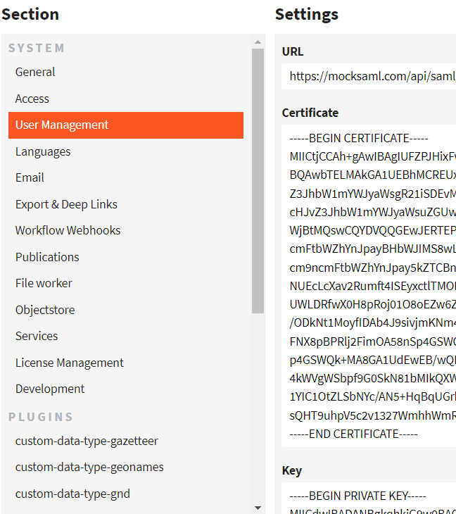 * In **User Mapping** define how the SAML user is created in fylr. Upon each login the SAML users are mapped to fylr users. If an user already exists, an update is performed. Working with mocksaml.com: