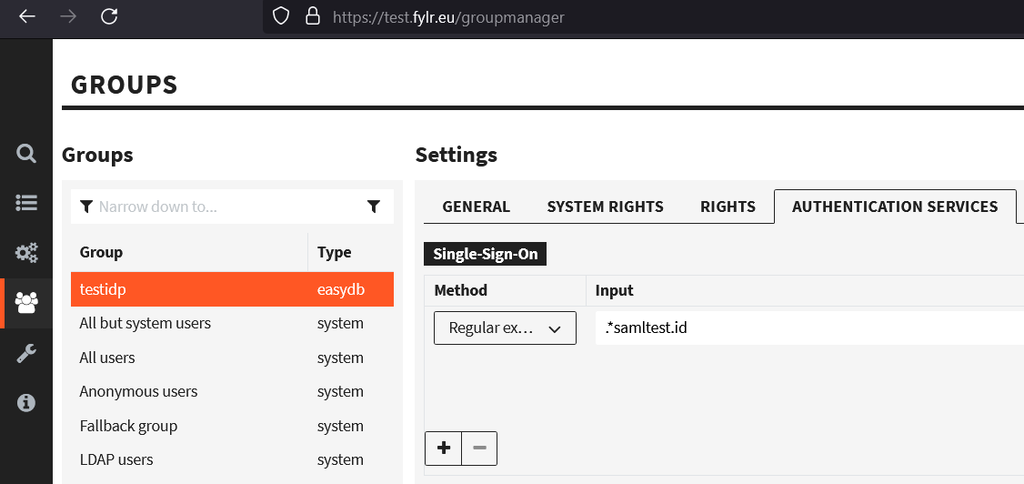 3. In this group's configuration > `AUTHENTICATION SERVICES` > below `Single-Sign-On` add an entry with Method `Regular Expression` and Input `.*samltest.id` (see following screenshot).