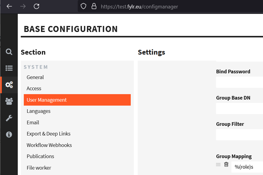 1. In fylr-URL/configmanager > `User management` > `SAML` add into the form field `Group Mapping` the value `%(role)s` (see following screenshot).